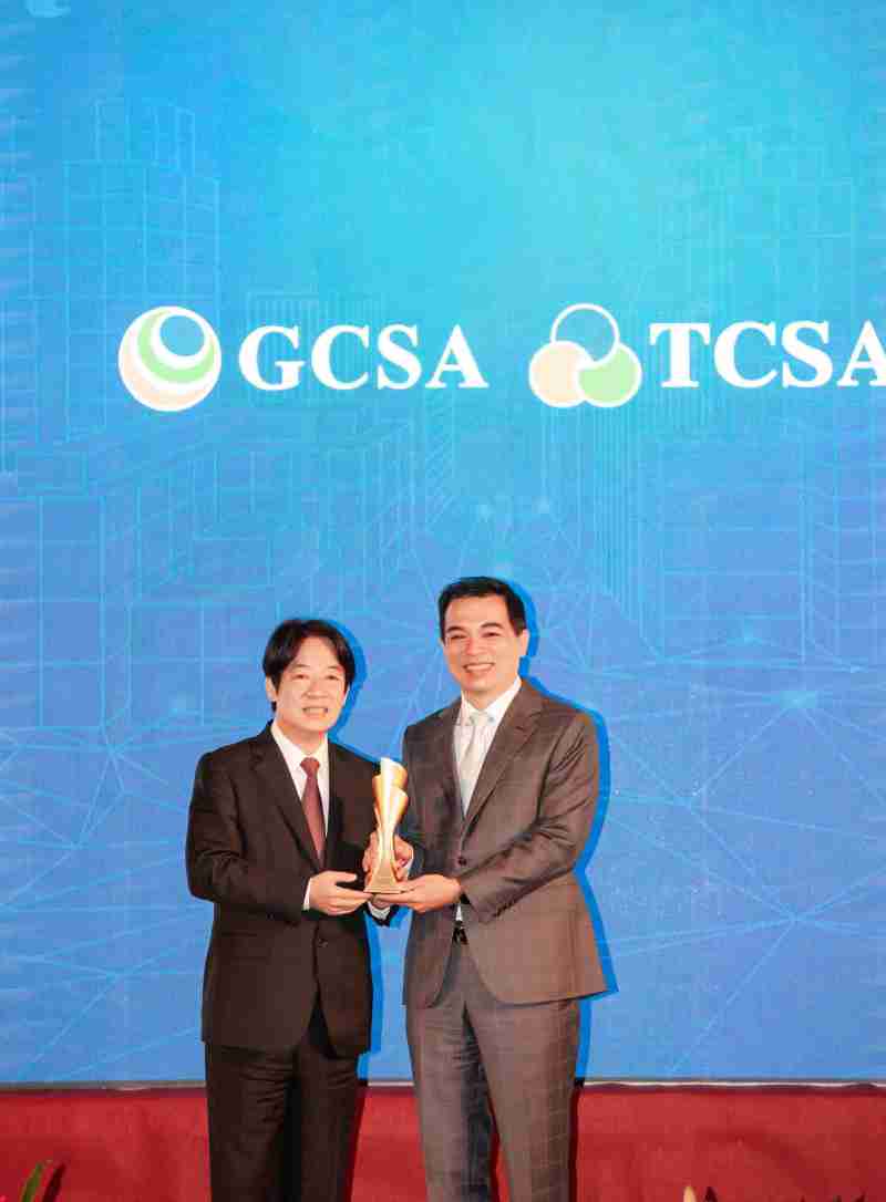 达全方位永续表现获全球永续奖及台湾永续奖肯定,,,,由副总统赖清德颁奖 (左),,,至成国际总经理柯富仁 (右) 代表领奖