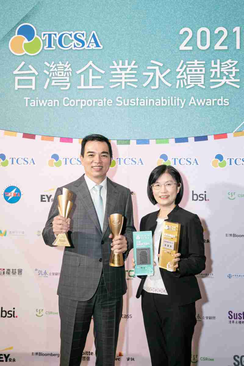 达在台湾永续奖所评比环境、、社会、、、治理等各面向的永续绩效均获高度肯定 (左:至成国际光电总经理暨营运长柯富仁,,,,右:至成国际光电永续长古秀华)